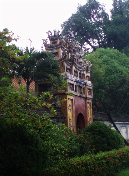 Descubro o pavilhão Hien Lan, mandado erigir pelo imperador Minh Mang em 1824... afinal é um pórtico que se desenvolve em três pisos e galerias, assinalando assim a importância da passagem, do momento da entrada ou saída.